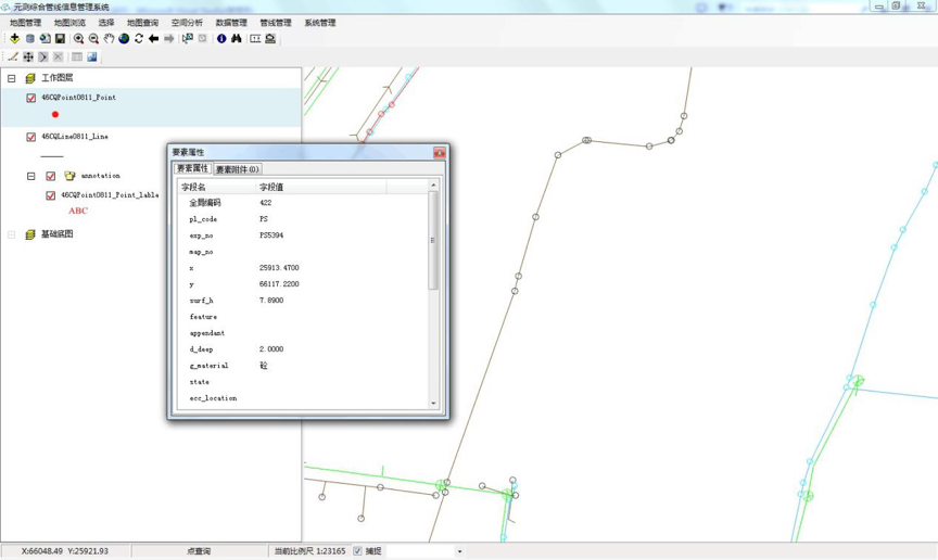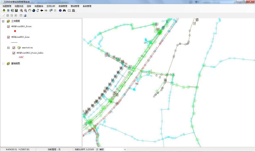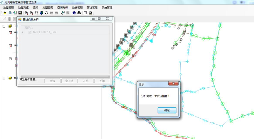 測(cè)管線信息管理系統(tǒng)功能有地圖管理、地圖瀏覽、地圖查詢、空間分析、數(shù)據(jù)管理、管線管理、系統(tǒng)管理等多方面功能。地圖管理又包含導(dǎo)入數(shù)據(jù)、添加shape文件、添加postGIS層圖、加載軟件在線地圖、加載影像文件、保存圖片、直接打印、保存地圖工程文件、加載地圖工程文件、退出系統(tǒng)等數(shù)據(jù)處理工具;地圖瀏覽包含放大、縮小、平移、全圖、設(shè)置地圖比例尺等;地圖查詢包含點(diǎn)擊查詢、測(cè)量長(zhǎng)度、測(cè)量面積、屬性查詢等;空間分析包含緩沖區(qū)、清除緩沖區(qū);數(shù)據(jù)管理包含數(shù)據(jù)建庫(kù)、數(shù)據(jù)庫(kù)管理;管線管理包含水平凈距分析、垂直凈距分析、扯旗標(biāo)注分析、最短短徑分析、覆土深度分析、連通路徑分析、管網(wǎng)故障分析、管線交叉分析、橫斷面分析等。